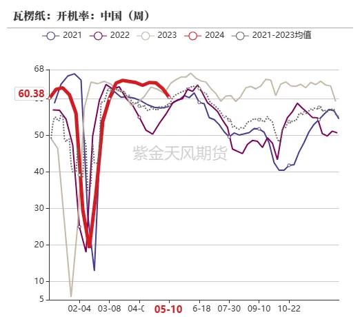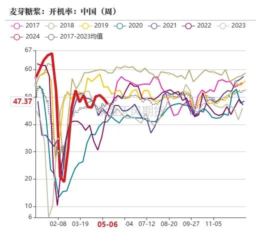 截止5月10日当周,F55果葡糖浆开机率为在40.35%,开工较上周下滑7.43个百分点,五一假期时代,部分企业挺价限产,导致开工下滑;麦芽糖浆开工率为47.37%,环比上周下滑1.97个百分点,下流需求淡季,五一时代部分企业限产,导致开工下滑;瓦楞纸开机率60.38%,环比上周裁减2.46%;箱板纸开工63.71%,环比上周裁减1.21%。