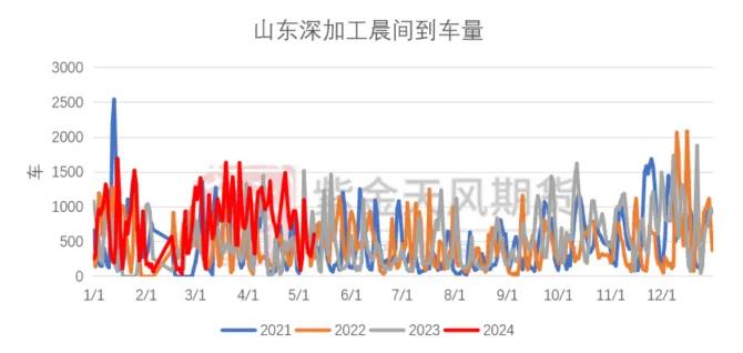 截止5月10日当周,山东深加工到车量累计2090辆,环比上周2315辆,减少225辆,降幅9.71%。