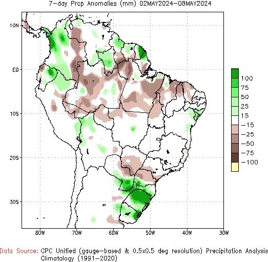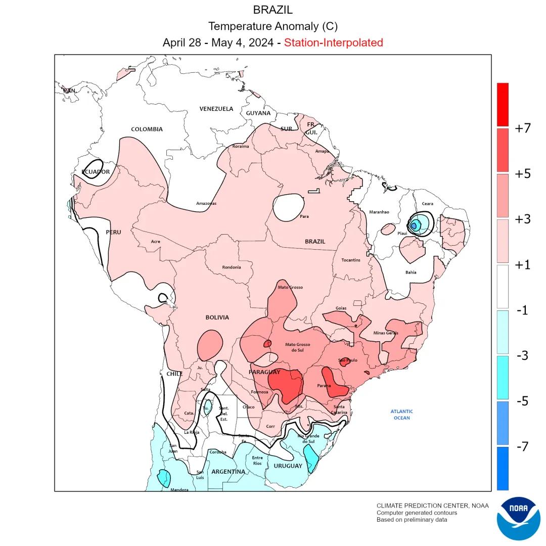5月10日当周,巴西玉米主产区气温距平值偏高,中部地区降水与往年收支不大,南部地区降水较多;NOAA瞻望,巴西玉米主产州未来6-10日气温依旧偏高,巴西南部州南里奥格兰德州降水依旧较多,但巴西中部玉米主产州马托格罗索州、帕拉纳州干旱情况或将握续,不利于当地二茬玉米的滋长发育。