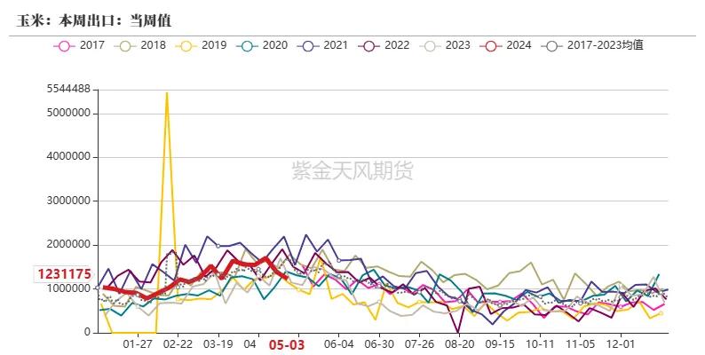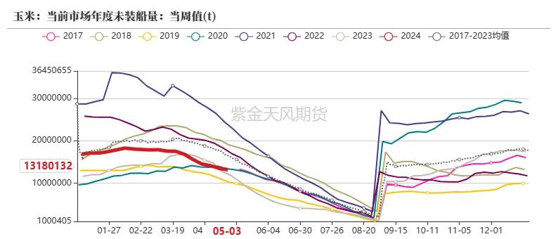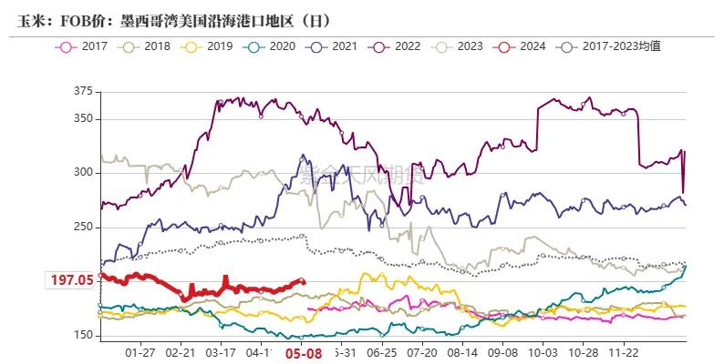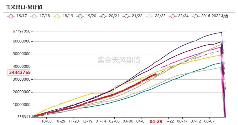 5月10日当周,好意思国2023/2024年度玉米出口净销售为88.9万吨,前一周为75.8万吨,环比加多17.28%;好意思玉米出口量总量3444.3万吨,未交割销售量1318.01万吨。总体销售程度为87.21%,高于前年同期22.68个百分点,总体销售程度较前年同期略快。