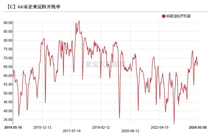 截止5月10日当周,66家企业淀粉开机率为67.95%,较上周升高1.6%。