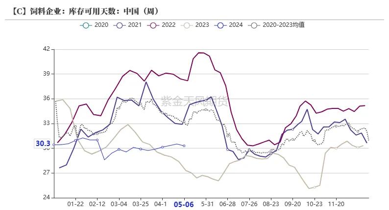 截止5月10日当周,样本饲料企业玉米平均库存30.33天,较上周减少0.19天,环比减少0.65%,同比加多11.09%。