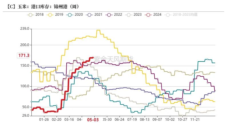 截止5月10日当周,朔方四港玉米库存共计375.5万吨,周环比加多8.4万吨,口岸库存出现慢慢加多的趋势。原因在于东北地区粮源上量加多,售粮程度进一步鼓吹,口岸玉米供应加多。