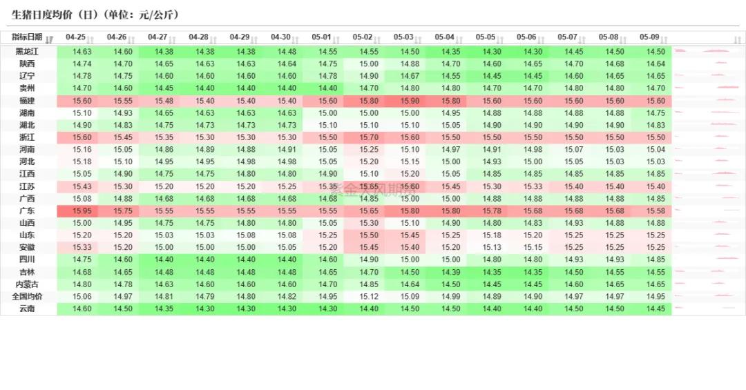 饲用需求:偏空 上周猪价呈现窄幅涨跌调遣,周度重点稍显偏强。供应端,五一节前二育大猪围聚出栏,节后多地肥猪供应占比有所下降;且标肥价差回首,边界企业握续压栏增重意向低,多出栏适重猪源为主。需求端,节后市集需求回落,冻品猪肉消化肃肃,冻品库容率合座变化不大。末端消费不旺,各地气温大批升高,白条走货减淡。瞻望下周生猪市集或保管供强需弱口头,行情或窄幅走弱,猪价重点小幅下移。