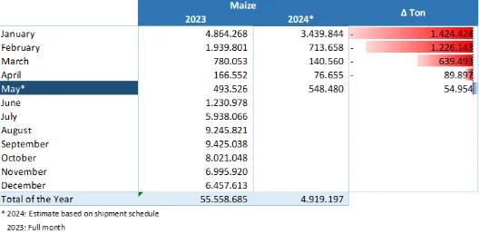 截止当周,巴西玉米2024年1-4月累计出口437.07万吨,比拟前年1-4月出口775.06万吨,减少337.99万吨,降幅43.60%。